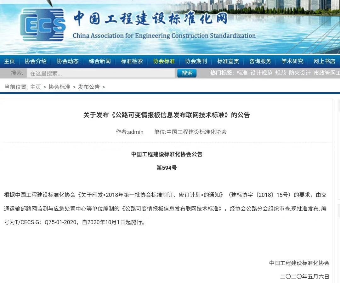 2020年5月6日,中國工程建設標準化協會正式發布了《公路可變情報板信息發布聯網技術標準》,自2020年10月1日起施行。