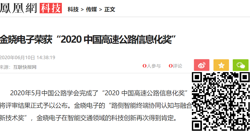 近日,金曉電子研發的“路側智能終端協同認知與融合控制技術”榮獲中國公路學會“2020中國高速公路信息化獎”的“創新技術獎”,獲獎信息受到了多家主流媒體的關注,鳳凰網、網易、今日頭條、新浪等媒體對金曉電子在智能交通領域的科技創新進行了報道。