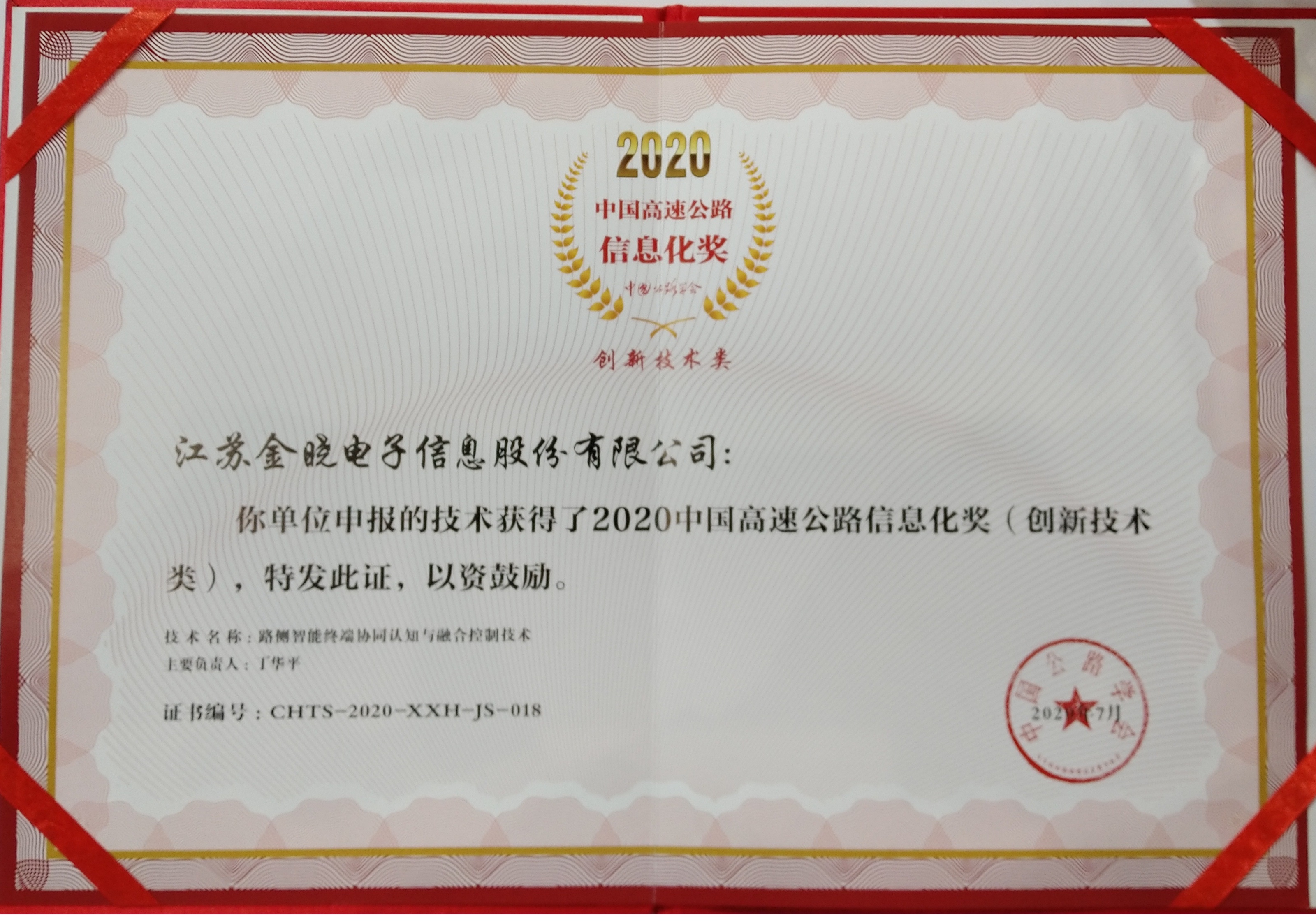 大會開幕式之后舉行了“2020中國高速公路信息化獎”的頒獎儀式,金曉電子的“路側智能終端協同認知與融合控制技術”獲得“創新技術類”獎項。