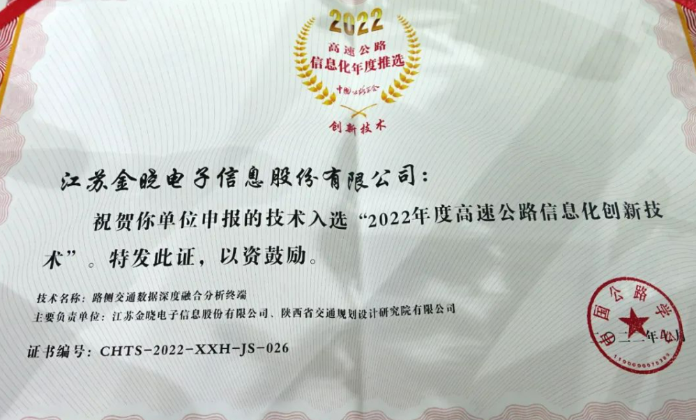 金曉電子亮相24屆中國高速公路信息化大會 聯(lián)合陜西省交通規(guī)劃設(shè)計研究院斬獲“2022年度創(chuàng)新技術(shù)獎”殊榮
